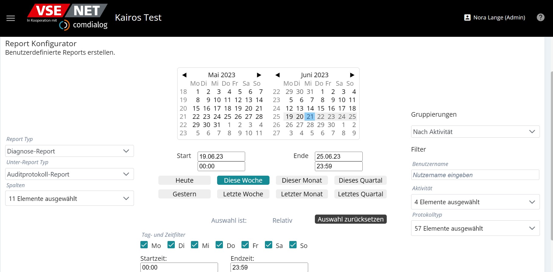 Sie finden den Auditprotokoll-Report unter Report Typ Diagnose Report. Wählen Sie dann bei Unter-Report Typ Auditprotokoll-Report aus (links im folgenden Bild zu erkennen)