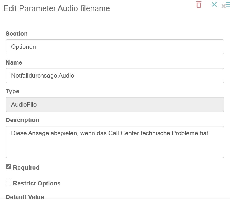 Einige literale Parameter (vom Typ AudioFile, Boolean, Integer oder String) können so konfiguriert werden, dass sie vom Benutzer konfigurierbare Werte akzeptieren. Das bedeutet, dass der Ersteller des Routingplans zwar die Standardwerte für diese Parameter festlegt, diese aber von einem Administrator mit der Berechtigung, Servicenummern zu ändern, überschrieben werden können, um sie den eigenen Anforderungen anzupassen. (Die Parameter sind an die mit ihnen verknüpften Servicenummern und nicht an den Routingplan gebunden).